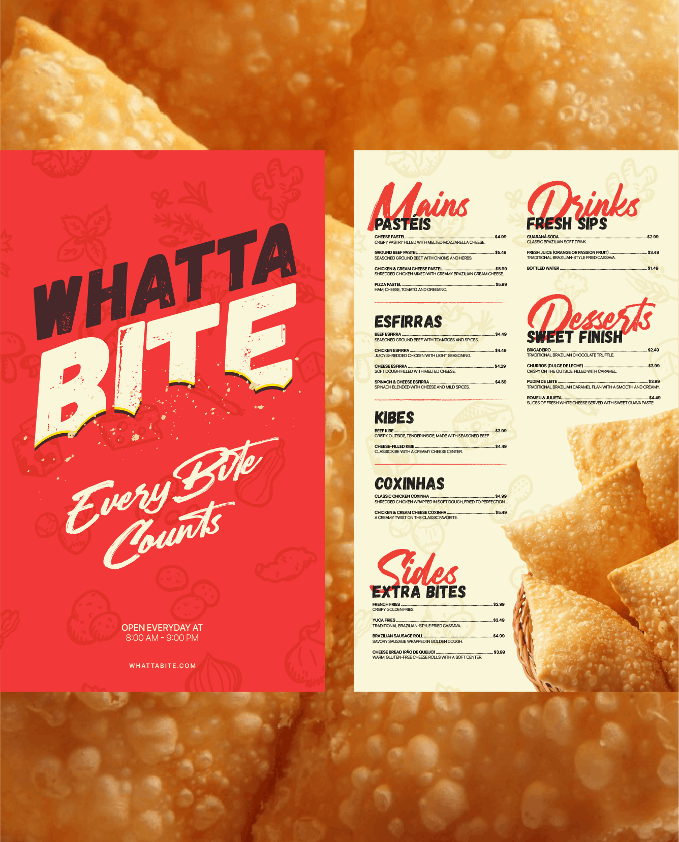 The result is a vibrant and welcoming brand presence that celebrates Brazilian street food culture and supports Whatta Bite’s expansion into a new market with confidence and authenticity.